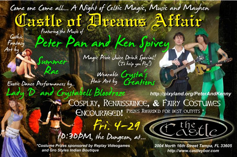 Come to this exciting and fun event at the Castle in Ybor city, Tampa. Here is the place that inspired Peter's song bearing the same name, where "vampire girls wear wings and lace, elves and fairies dance in space, while wizards conjure welcome... in this place!" In the spirit of our taste for generally silliness and laughs, please feel free to attend any and all of our performances with wings, capes, and all manner of cosplay, magical and Renaissance attire!
