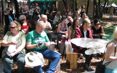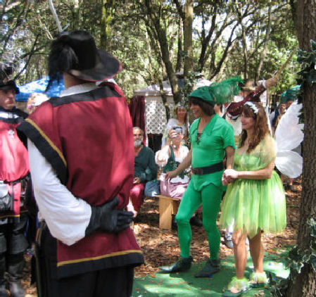 The King read a lovely love poem from Shakespere. Then, during the part where the King proclaims "anyone knows of any impediment why these two should not be wed, let them speak now", Our guardsman pulled his sword, defying anyone to speak a word. One of many fun and memorable moments!