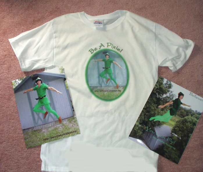 Below re some admittedly hastily done photo showing all these items, Shirt, Mouse Pads and photos, and below that is a closeup of the T-Shirt graphic. If you ask for a photo, remember to tell me which one you want, whether you want it signed, and if so, who to? (Peter Pan doesn't say 'to whom' )